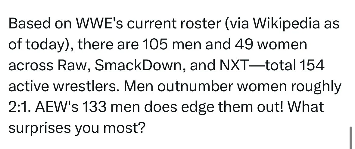 WWE has a roster consisting of 105 male wrestlers and 49 female wrestlers, representing a balanced mix that is quite typical in the professional wrestling industry. On the other hand, AEW’s roster shows a MUCH different composition.