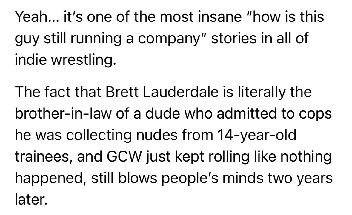 This year, I wrote some troubling stories about independent wrestling. Here's another one: Brett Lauderdale, owner of GCW, has a brother-in-law named Joey Welcome (real name: Joseph Cervino), who on a police tape admitted to collecting nude photos from 14-year-old trainees.