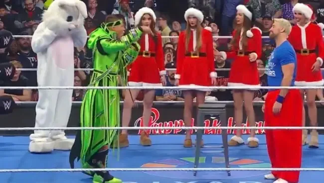 Joe Hendry was dropping the most savage Christmas banger ever (shoutout to the “tiny balls line), with Otis dancing like a maniac, Akira Tozawa vibing on the ropes, and R-Truth in full Easter Bunny mode stealing the show…