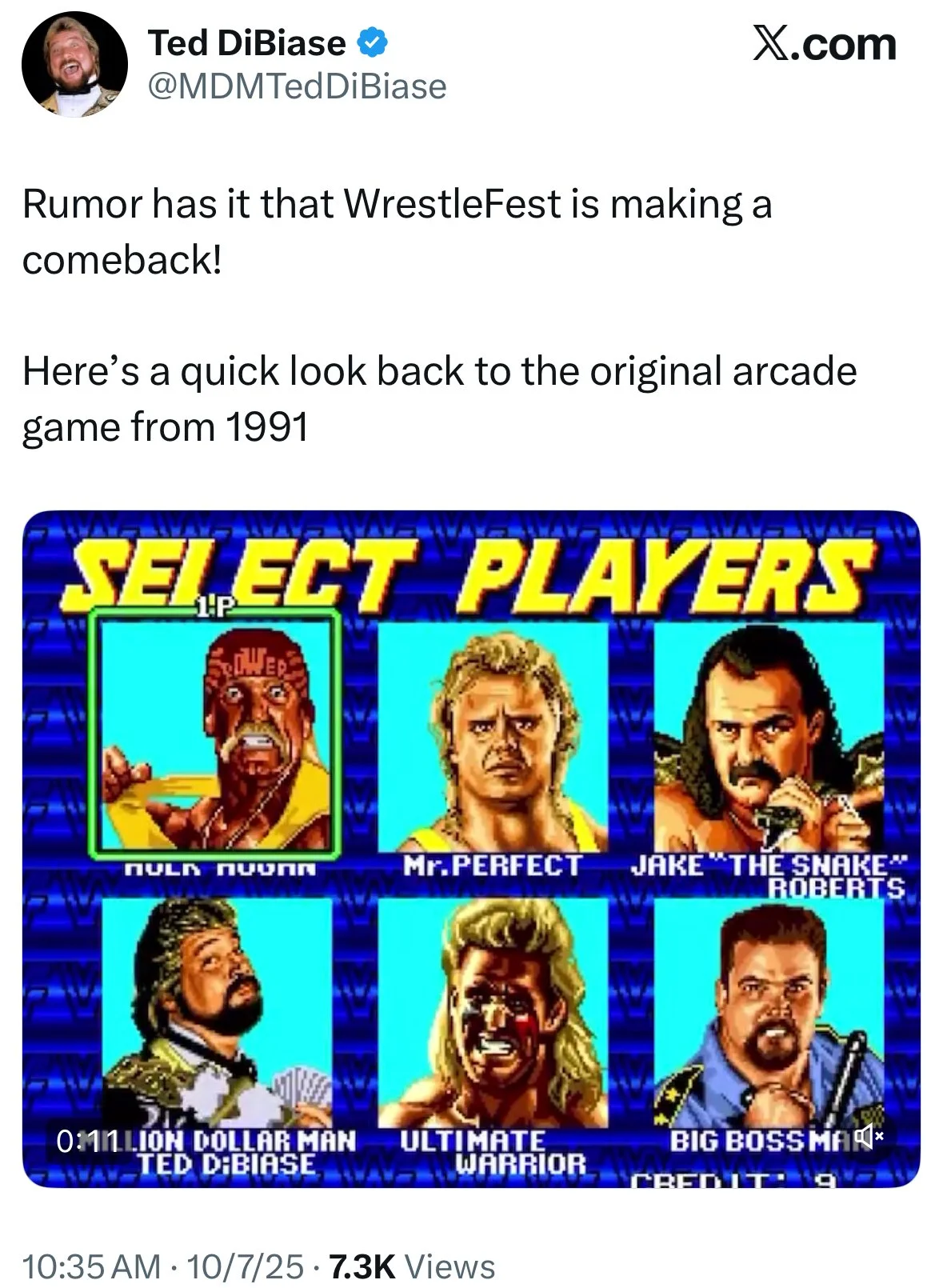 One of the wealthiest and most iconic figures in professional wrestling history, The Million Dollar Man, Ted DiBiase, recently teased the highly anticipated return of WrestleFest. The original WWF WrestleFest, a beloved classic arcade game developed by Technō Japan in 1991, is set to be re-released soon as a dedicated arcade home cabinet.